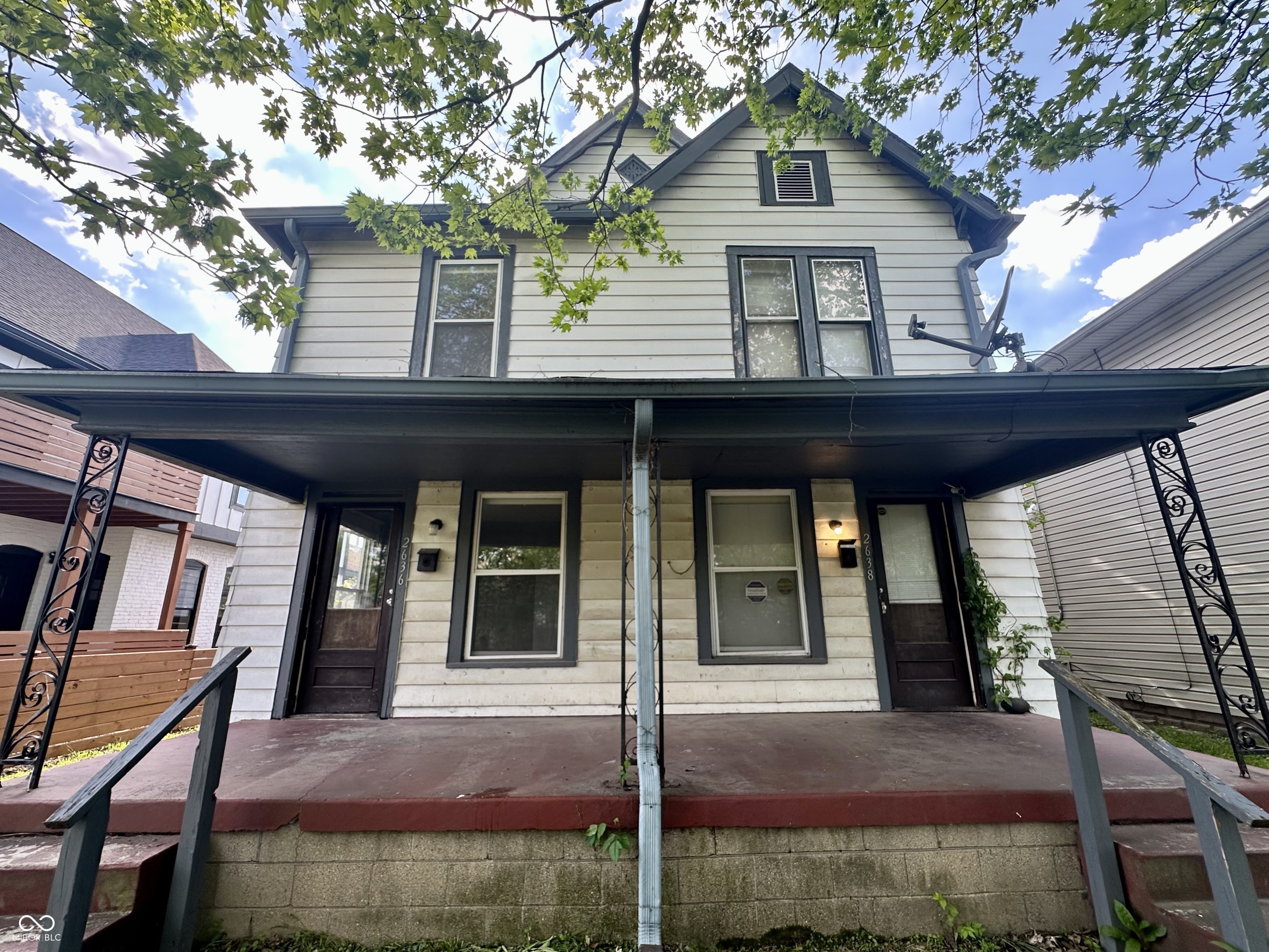 Investor special! Duplex with over 1,300 sq ft per unit plus basement storage, ideally located near the Monon Trail, Downtown Indy, Bottleworks, and IUPUI. Each unit offers 2 bedrooms plus a bonus room, spacious living/dining, eat-in kitchen, and main-level laundry. Recent updates to 2636 include newer furnace, water heater, and partial window replacements (2020). Features covered front porch, rear porch, paved parking pad, and additional basement storage. Unit 2636 is vacant and ready for your next tenant; Unit 2638 is tenant-occupied and is not on month-to-month lease. Area rents for similar sized units run $1,200-$2,000/month per side, leaving strong upside for cash flow and appreciation in this growing neighborhood.