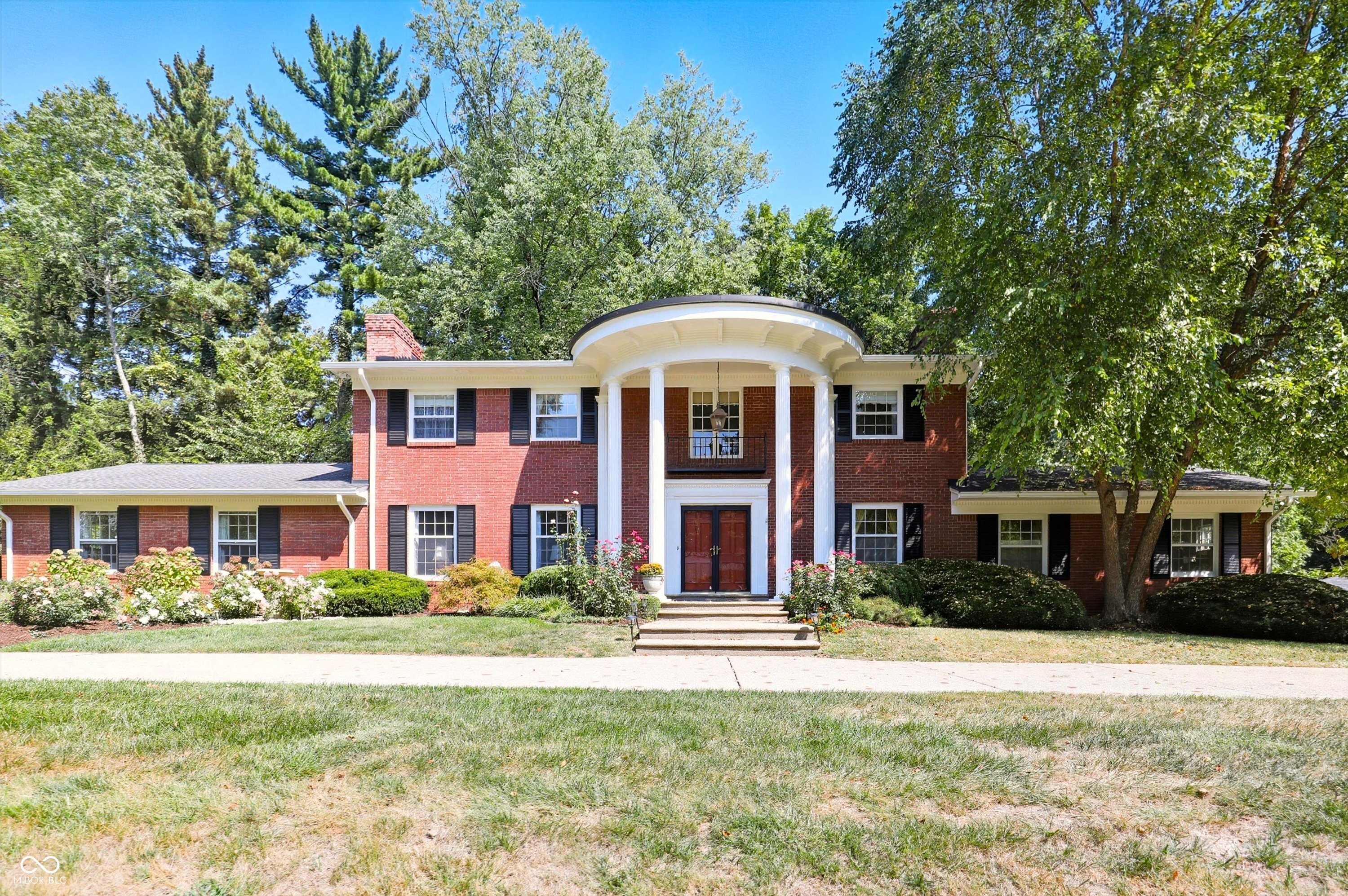 Welcome to this stunning Colonial and Greek Revival-style brick home, set on nearly an acre of beautifully landscaped grounds next to Broadmoor Country Club. A graceful semi-circular driveway and rear-load garage provide an elegant approach and plenty of parking. This 5-bedroom home is filled with character, offering 4 fireplaces, multiple living and entertaining spaces, and extensive updates throughout. The grand marble-tiled entry sets the tone, leading into a beautifully updated kitchen featuring natural stone countertops, custom cabinetry, stylish tile floors, enhanced lighting, and newer appliances. The impressive great room addition showcases soaring cathedral ceilings, custom built-ins for storage, and a stylish wet bar featuring a custom leaded-glass window, tile backsplash with and matching bar surround, classic white cabinetry, dual mini refrigerators, and wine cooler. Basement wine cooler is also included. A bright, inviting sunroom and multiple gathering spaces throughout the home offer endless opportunities for hosting family and friends. Outside, enjoy flower gardens, a charming replica playhouse, and a large paver patio designed for gatherings. Located just minutes from Newfields, Butler University, and Holiday Park, this home blends classic Colonial and Greek Revival architecture with modern updates for a one-of-a-kind living experience.